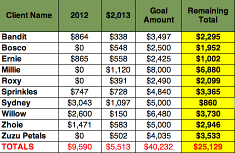 Second, a numbers update! Many have asked how the current clients are doing in terms of reaching their goals. It’s going to be difficult to keep up with the stats while I transition to Fundrazr on the website, so hopefully this will help!
