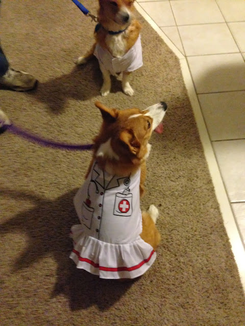 This year, Dexter decided he wanted a more sophisticated costume. He says he’s getting to old for all that puppy stuff, he says. And so Dexter donned his lab coat and went as a veterinarian and Violet was his vet tech.